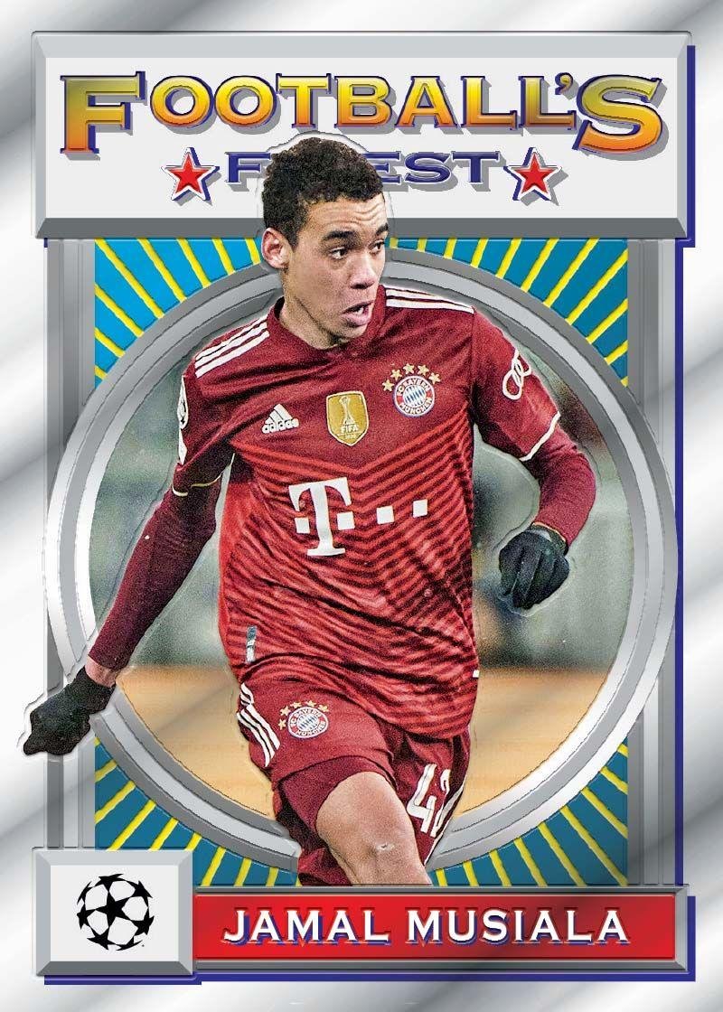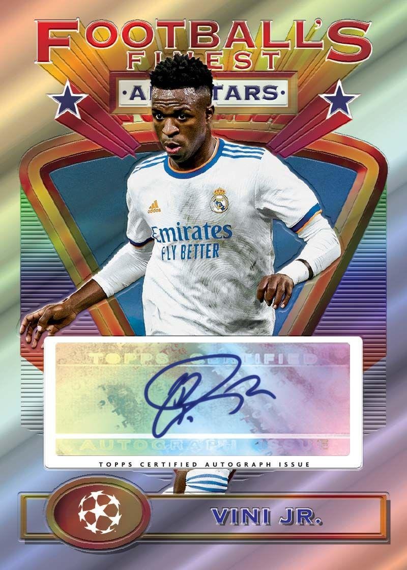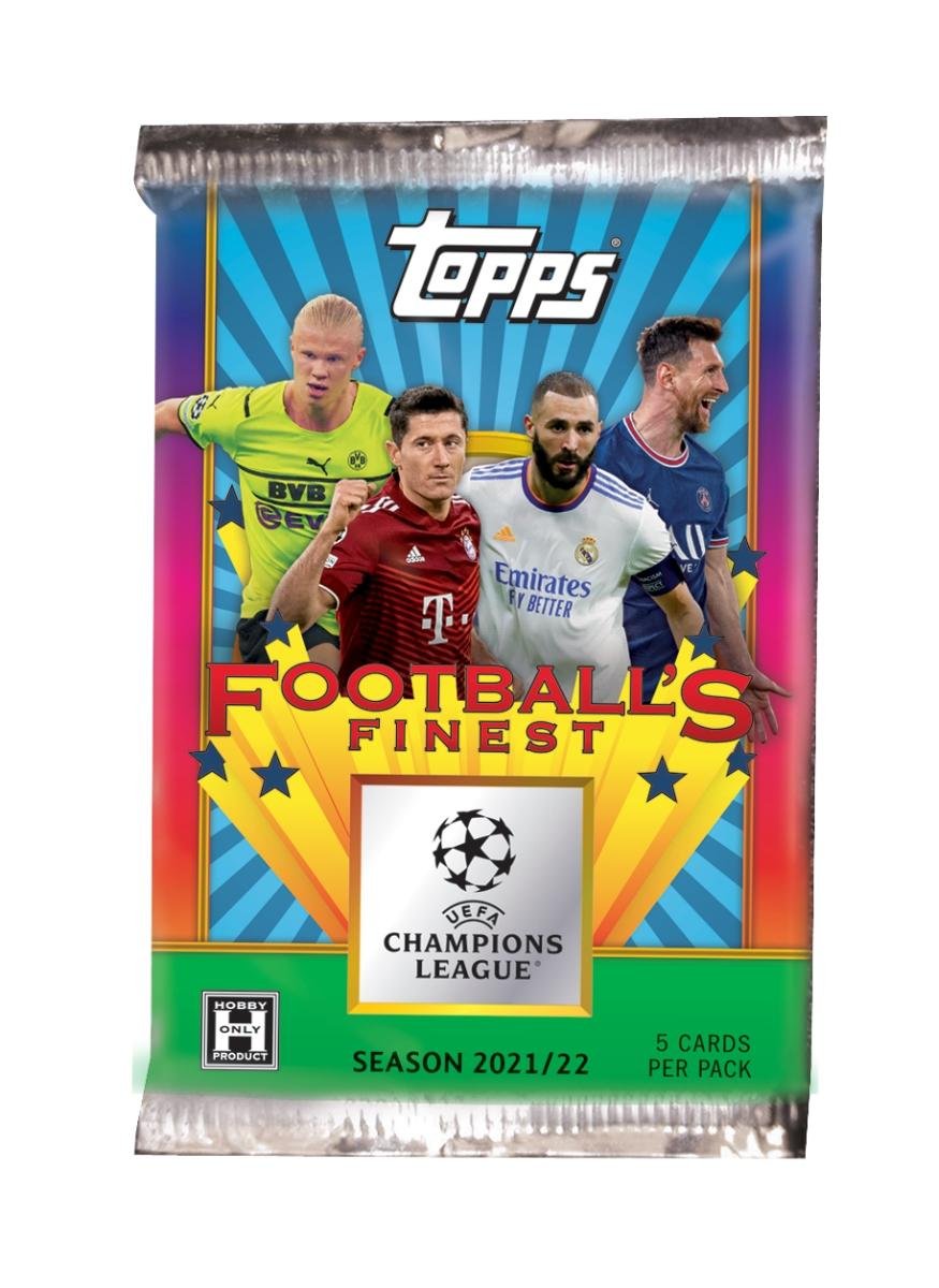 Each Box contains One Refractor and One Jumbo Topper Card! Each CASE contains One Autograph Card! Find Autographs from Erling Haaland, Lionel Messi , Neymar Jr., Cristiano Ronaldo, Jude Bellingham, Kevin De Bruyne, and many more Topps Finest Flashbacks UEFA Champions League 2021/22 makes its debut and transports collectors back to the dawn of the chrome refractor era. Collect Football’s Finest on the original 1993 Topps Finest design! Hunt rare refractors, parallels, and key rookies of the 2021/22 season. Collect the 199-Card Base Set and the 33-Card All-Star Subset! Look for 1993 Football’s Finest Autographs (1:491 packs), 1993 Football’s Finest All-Star Autographs (1:447 packs) and Rookie Image Variation Autographs (1:2,951 packs)! 2022 Topps Finest Flashbacks Base Refractor Parallels Breakdown: Base: Refractor – 1:18 packs Gold Refractor #/50 – 1:45 packs Prism Refractor #/35 – 1:65 packs Black Refractor #/25 – 1:91 packs Red Refractor #/5 – 1:455 packs Superfractor 1/1 – 1:2,279 packs Jumbo Topper: Refractor – 1:3 boxes Gold Refractor #/50 – 1:13 boxes Prism Refractor #/35 – 1:19 boxes Black Refractor #/25 – 1:26 boxes Red Refractor #/5 – 1:126 boxes Superfractor 1/1 – 1:607 boxes 2022 Topps Finest Flashbacks UEFA Autographs Rundown: 1993 Football’s Finest Autographs: Base Auto #’d – 1:491 packs Aqua Refractor #/20 – 1:1,026 packs Gold Refractor #/15 – 1:1,765 packs Orange Refractor #/10 – 1:2,449 packs Red Refractor #/5 – 1:4,932 packs Superfractor 1/1 – 1:24,005 packs 1993 Football’s Finest All-Star Autographs: Base Auto #’d – 1:447 packs Aqua Refractor #/30 – 1:1,026 packs Gold Refractor #/15 – 1:1,765 packs Orange Refractor #/10 – 1:2,449 packs Red Refractor #/5 – 1:4,932 packs Superfractor 1/1 – 1:24,005 packs Rookie Image Variation Autographs: Base Auto #’d – 1:2,951 packs Red Refractor #/5 – 1:15,003 packs Superfractor 1/1 – 1:72,014 packs 1993 Football’s Finest Autographs Set Checklist 18 cards. 1:491 packs. Serial numbered. REFRACTOR PARALLELS: Aqua #/30 (1:1,026), Gold #/15 (1:1,765), Orange #/10 (1:2,449), Red #/5 (1:4,932), SuperFractor 1/1 (1:24,005). FA-A Angelino – RB Leipzig FA-AE Anthony Elanga – Manchester United FA-CP Cole Palmer – Manchester City FC FA-FB Franco Baresi – AC Milan FA-FI Filippo Inzaghi – Juventus FA-FL Frank Lampard – Chelsea FC FA-FT Fernando Torres – Atletico de Madrid FA-GZ Gianfranco Zola – Chelsea FC FA-HE Harvey Elliott – Liverpool FC FA-HL Henrik Larsson – FC Barcelona FA-HM Harry Maguire – Manchester United FA-IC Iker Casillas – Real Madrid C.F. FA-KA Karim Adeyemi – FC Salzburg FA-PS Peter Schmeichel – Manchester United FA-RD Roberto Di Matteo – Chelsea FC FA-SG Steven Gerrard – Liverpool FC FA-TW Timothy Weah – LOSC Lille FA-XA Xabi Alonso – Real Madrid C.F. 1993 Football’s Finest All-Star Autographs Set Checklist 18 cards. 1:447 packs. Serial numbered. REFRACTOR PARALLELS: Aqua #/30 (1:1,026), Gold #/15 (1:1,765), Orange #/10 (1:2,449), Red #/5 (1:4,932), SuperFractor 1/1 (1:24,005). ASA-AF Ansu Fati – FC Barcelona ASA-CR Cristiano Ronaldo – Manchester United ASA-EC Eduardo Camavinga – Real Madrid C.F. ASA-EH Erling Haaland – Borussia Dortmund ASA-JB Jude Bellingham – Borussia Dortmund ASA-JF Joao Felix – Atletico de Madrid ASA-JG Jack Grealish – Manchester City FC ASA-KD Kevin De Bruyne – Manchester City FC ASA-LA Lautaro Martinez – FC Internazionale Milano ASA-LM Lionel Messi – Paris Saint-Germain ASA-MD Memphis Depay – FC Barcelona ASA-N Neymar Jr – Paris Saint-Germain ASA-P Pedri – FC Barcelona ASA-RG Ryan Gravenberch – AFC Ajax ASA-RL Romelu Lukaku – Chelsea FC ASA-ST Sandro Tonali – AC Milan ASA-TA Trent Alexander-Arnold – Liverpool FC ASA-V Vini Jr. – Real Madrid C.F. 6 Boxes Per Case, 15 Packs Per Box, 5 Cards Per Pack