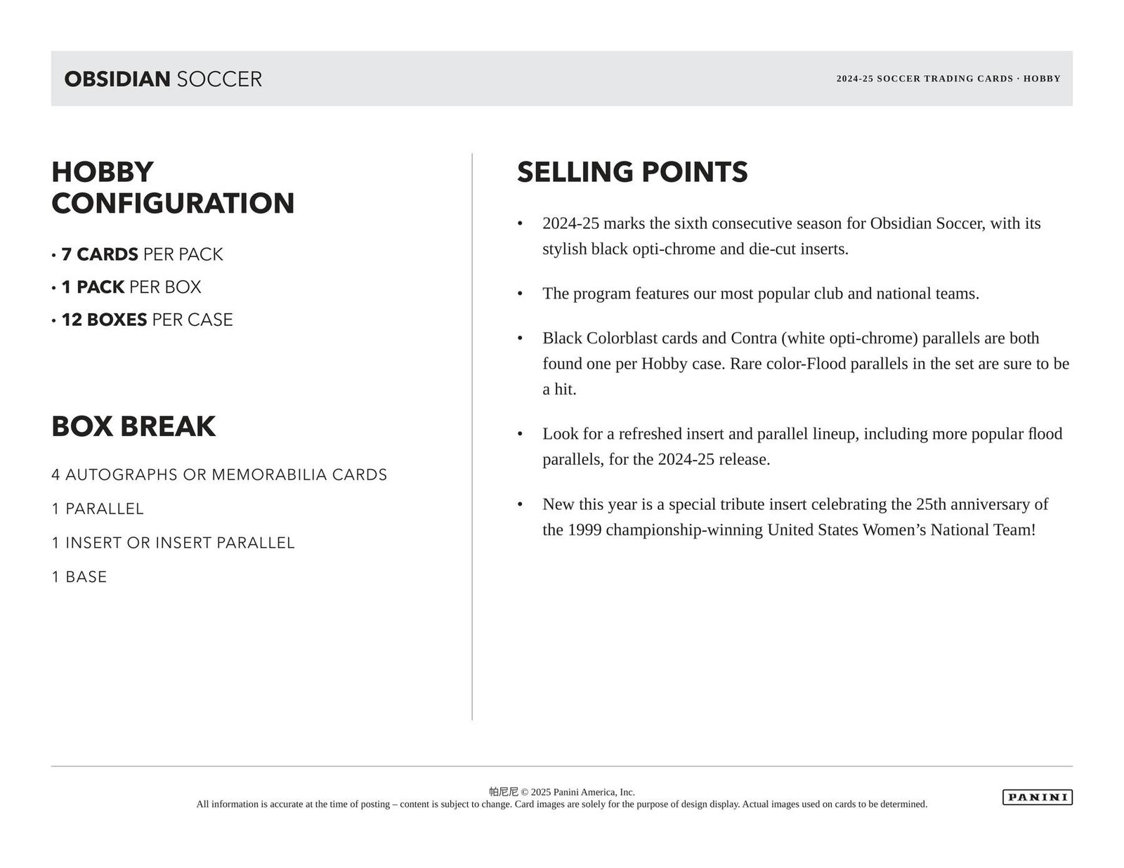 2024-25 marks the sixth consecutive season for Obsidian Soccer, with its stylish black opti-chrome and die-cut inserts.