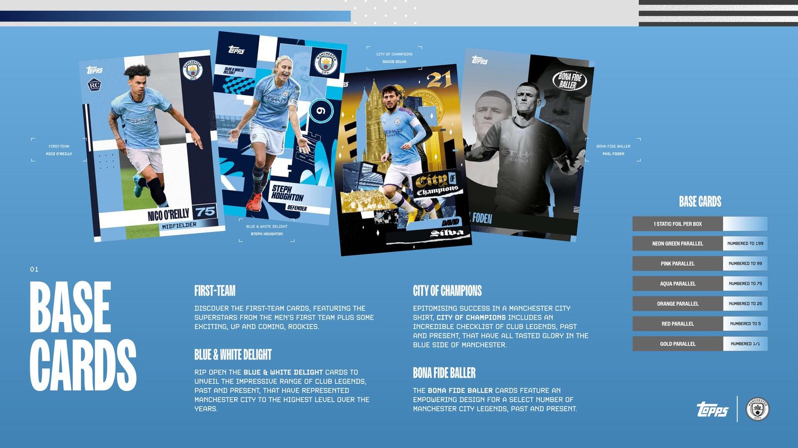 Dive into the base set and feel at home with the brand-new Blue and White Delight cards, live through the glory days with the City of Champions subset with a cluster of serial winners in City blue, and feel the chill with the ice-cold Bona Fide Baller cards, featuring some of the finest showstoppers to represent City.