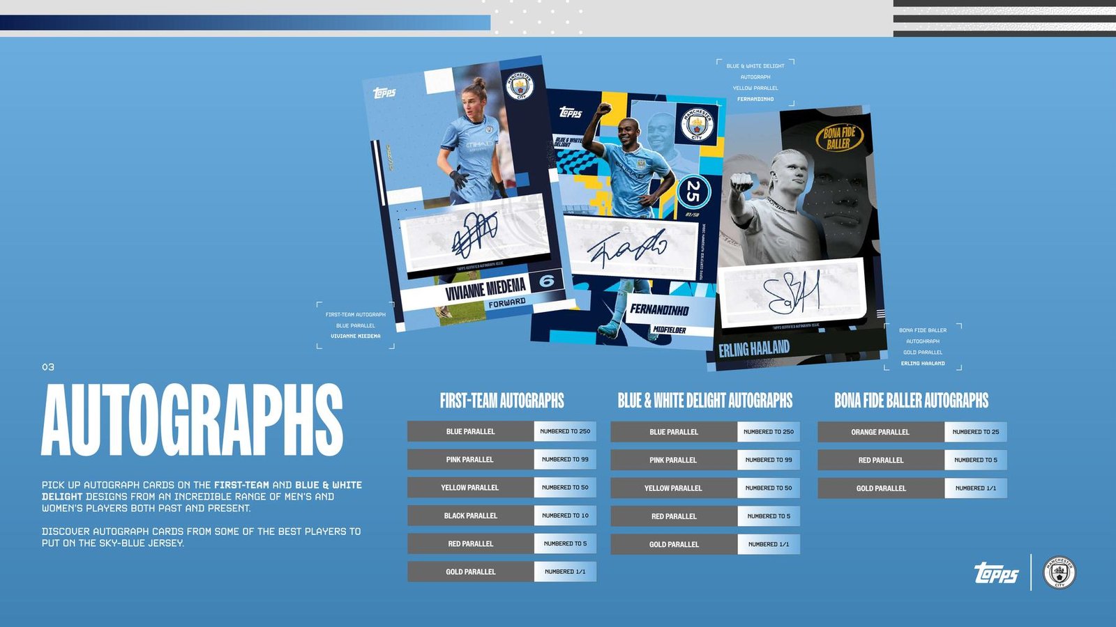 AUTOGRAPH RELICS: The autograph relics in this set are every collector’s dream! Pride in Battle Autograph Relics featuring men’s first-team players as well as a handful of MCFC legends.