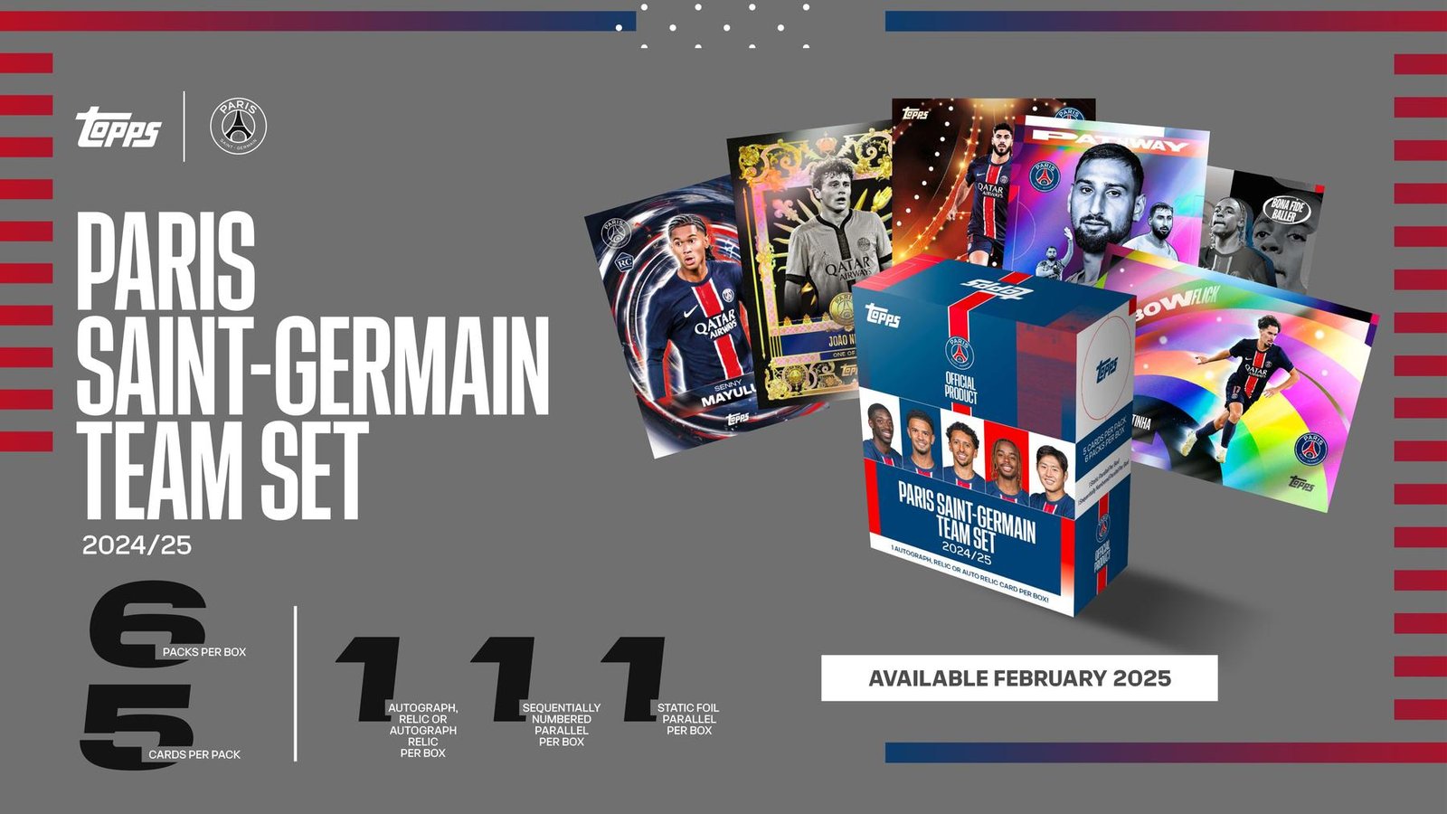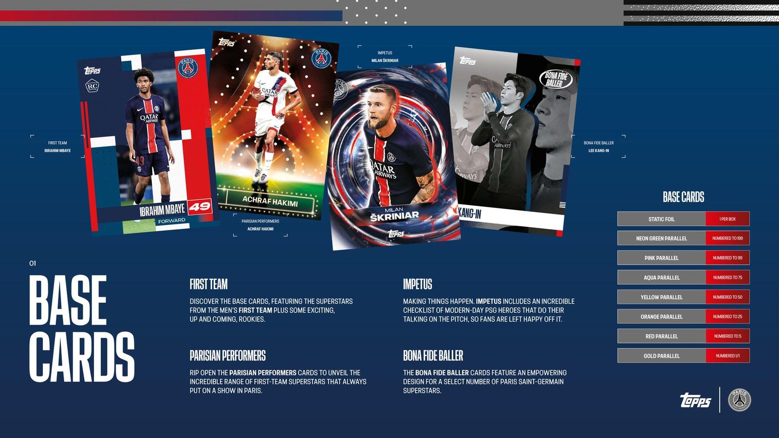 Collect the Base Set and begin with the sleek First-Team cards, fall in love with the star-studded Parisian Performers subset, and bring out your creative side with Impetus, featuring both Paris Saint-Germain’s creative players and defensive masters. Bringing