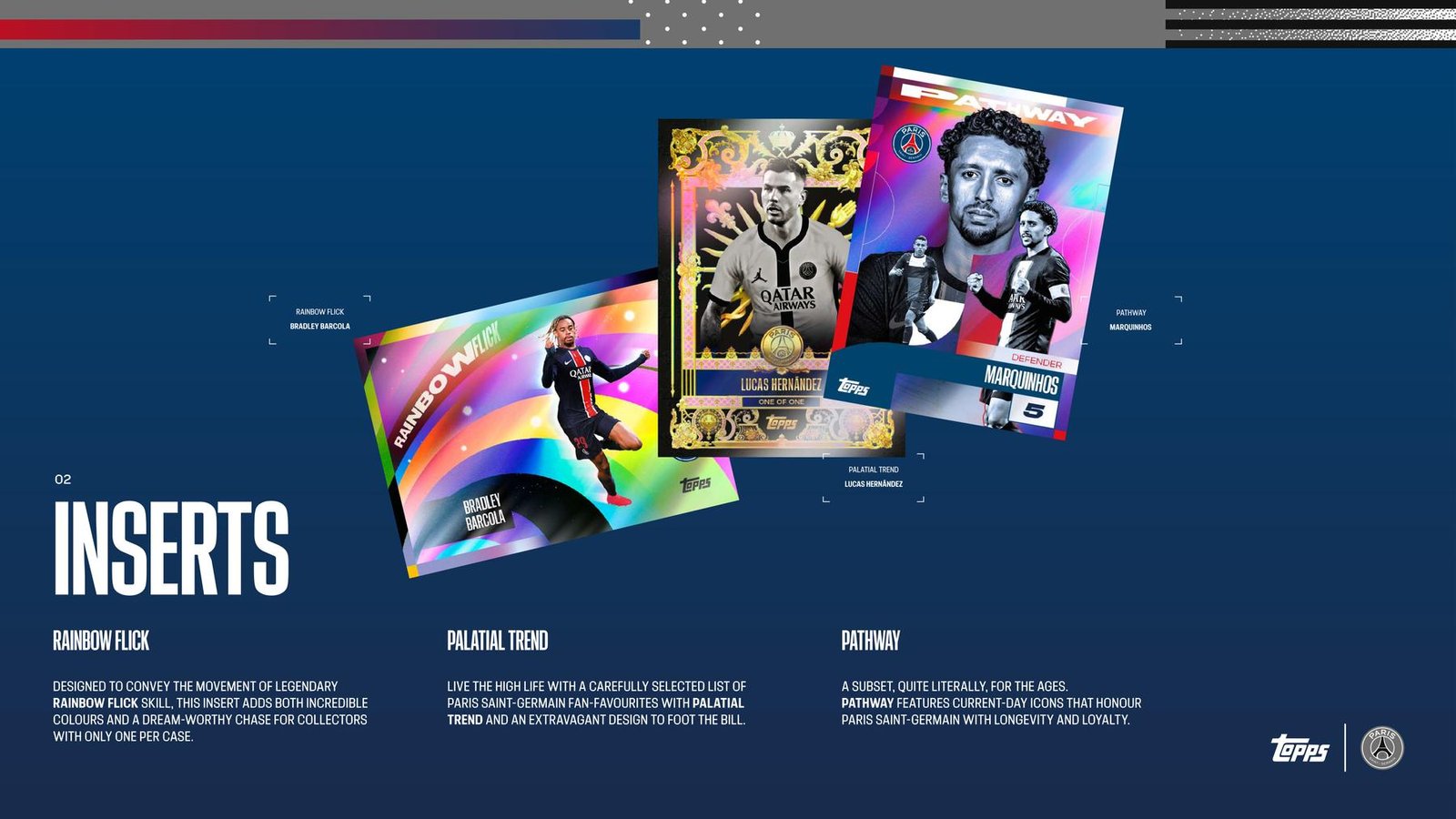 Found once in every two cases, Pathway pays homage to the long-standing Paris Saint-Germain first-teamers and appreciate the longevity on display, while Palatial Trend, true one-of-ones, provides the ultimate chase in this season’s Paris Saint-Germain Team Set, combining the high-end fashion of Paris with the high-end football stars of France. The Rainbow Flick case hit is