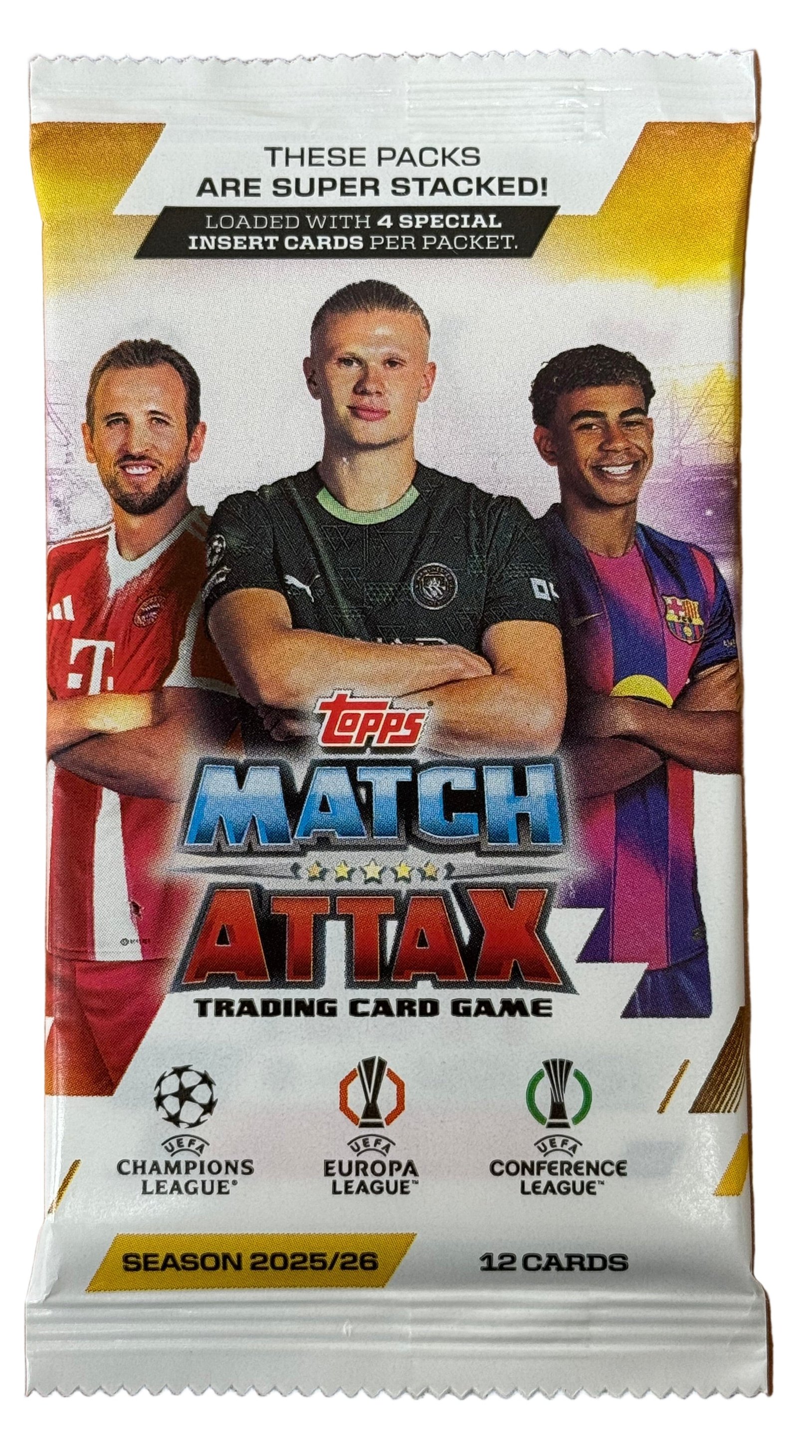 UCC Match Attax returns for the 25/26 season with a thrilling new collection featuring world class players from the UEFA Champions League, UEFA Europa League and the UEFA Europa Conference League. With 524 brand new cards to collect from exciting new categories such as Leaders, Cup Champions, Showboats, Magic Memories, Stealth Strike and Counter Attax, plus returning favourites such as Heritage, Team Badges, Chrome Shield, 100 Club and the unbeatable 100 club, these incredible cards give you everything you need to build a truly incredible collection. Look out for Black Edge cards, Infinity cards, Platinum Pull cards, Hall of Fame Chrome cards, Black Gold LE’s, the new Red Hot Yamal card and the Ice Cole Palmer cards to take you collection to a whole new level. Plus, will you be lucky enough to find a relic card or the Lethal Combo Auto card or other amazing autograph cards available throughout the collection?