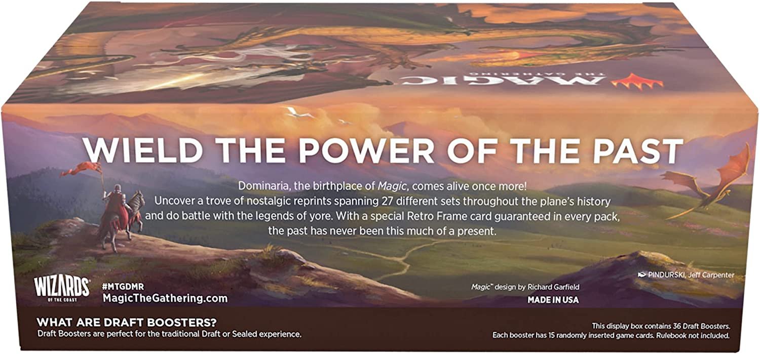 The Dominaria Remastered Draft Booster Box contains 36 Dominaria Remastered Draft Boosters. Each Draft Booster contains 15 cards and 1 token/ad card, including 1 card of rarity Rare or higher and 2–4 Uncommon, 9–11 Common, and 1 Retro Land cards.
