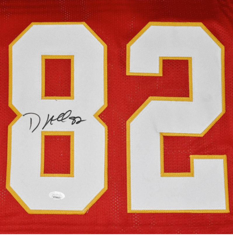 • A professional style red custom replica football jersey autographed by Dante Hall and authenticated by JSA