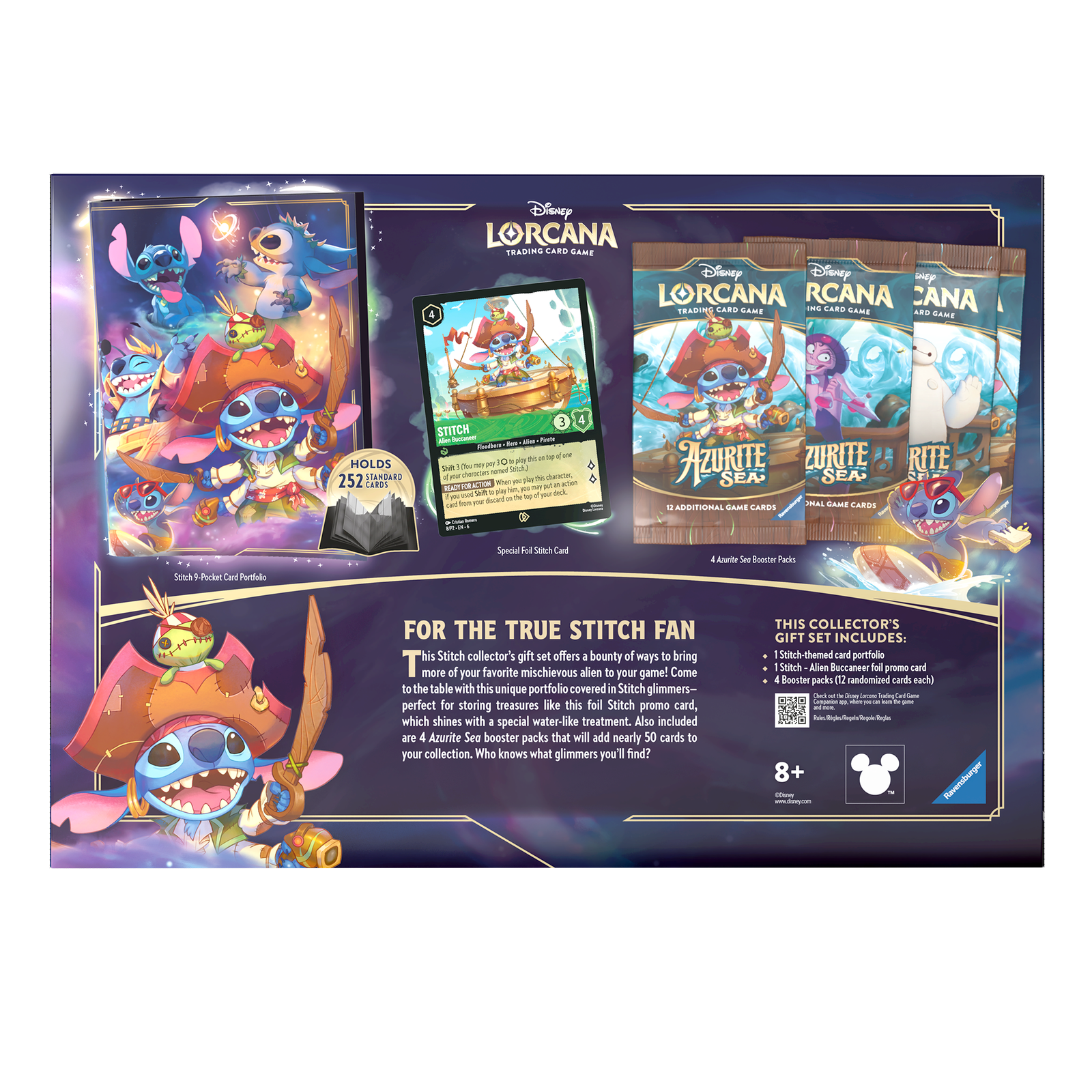 Swapping his surfboard for a pirate ship, Stitch is ready to sail to your home with such riches as a Stich – Alien Buccaneer promo card, 4 Azurite Sea booster packs, and a portfolio decked out with Stitch in his many glimmer forms.