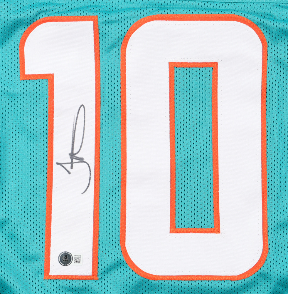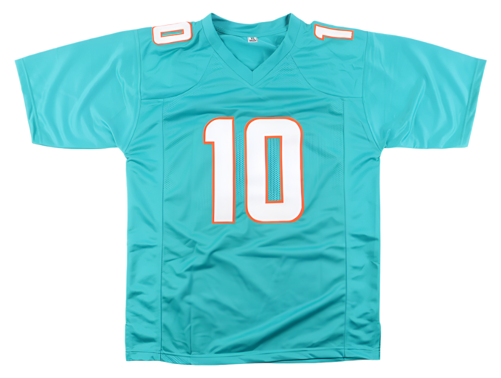 A professional style custom jersey with everything sewn on, size XL. Hand-signed by Tyreek Hill.